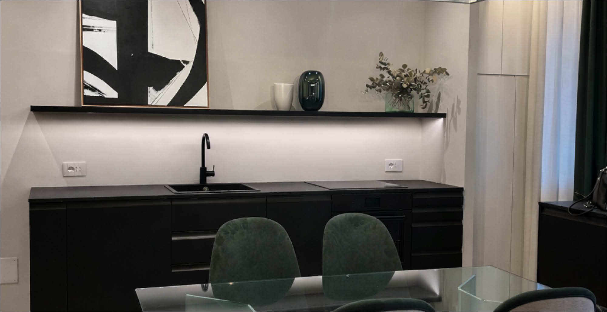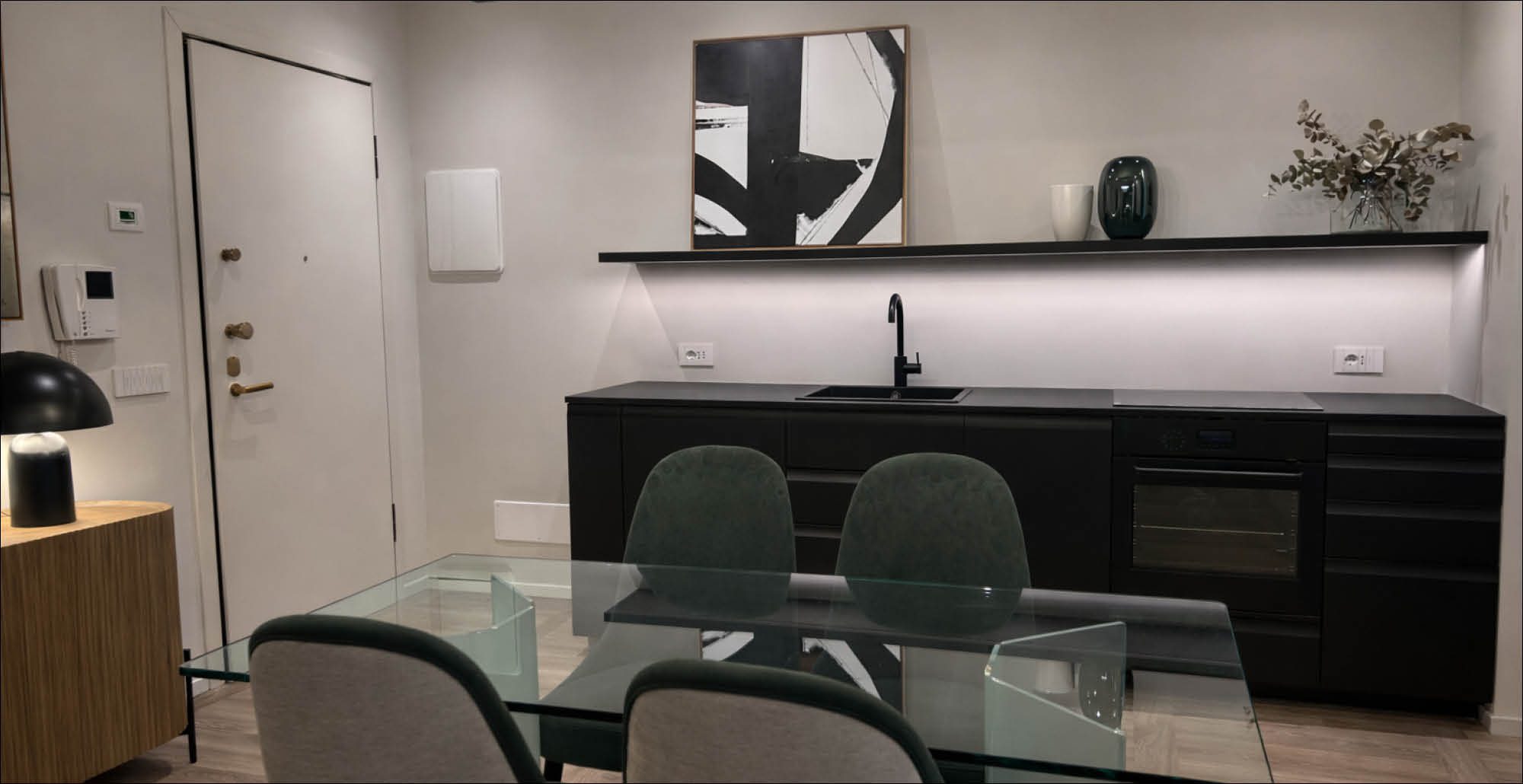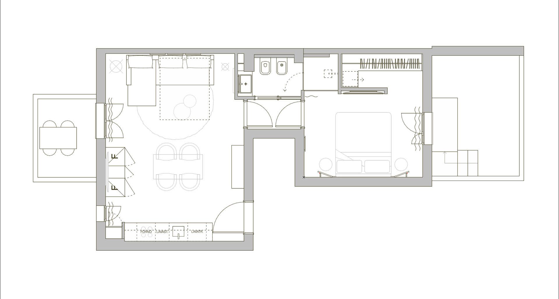 Appartamento indipendente di 45 mq con camera matrimoniale separata, living con angolo cottura e cabina armadio.