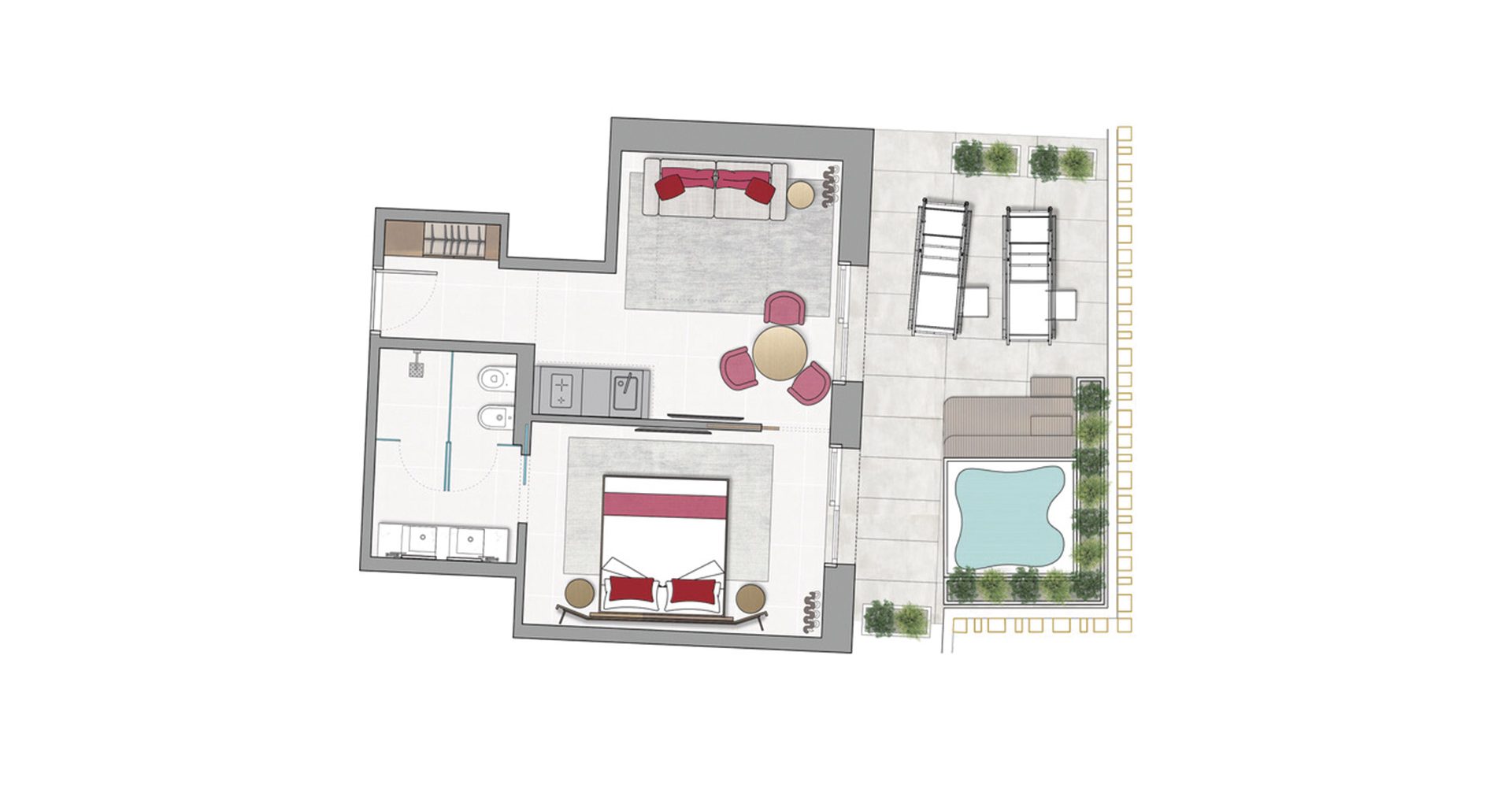 Grande terrazzo con Jacuzzi open sky, per attimi di autentico relax immersi nella luce di viale Ceccarini, tra fascino urbano e un’esclusiva tranquillità.