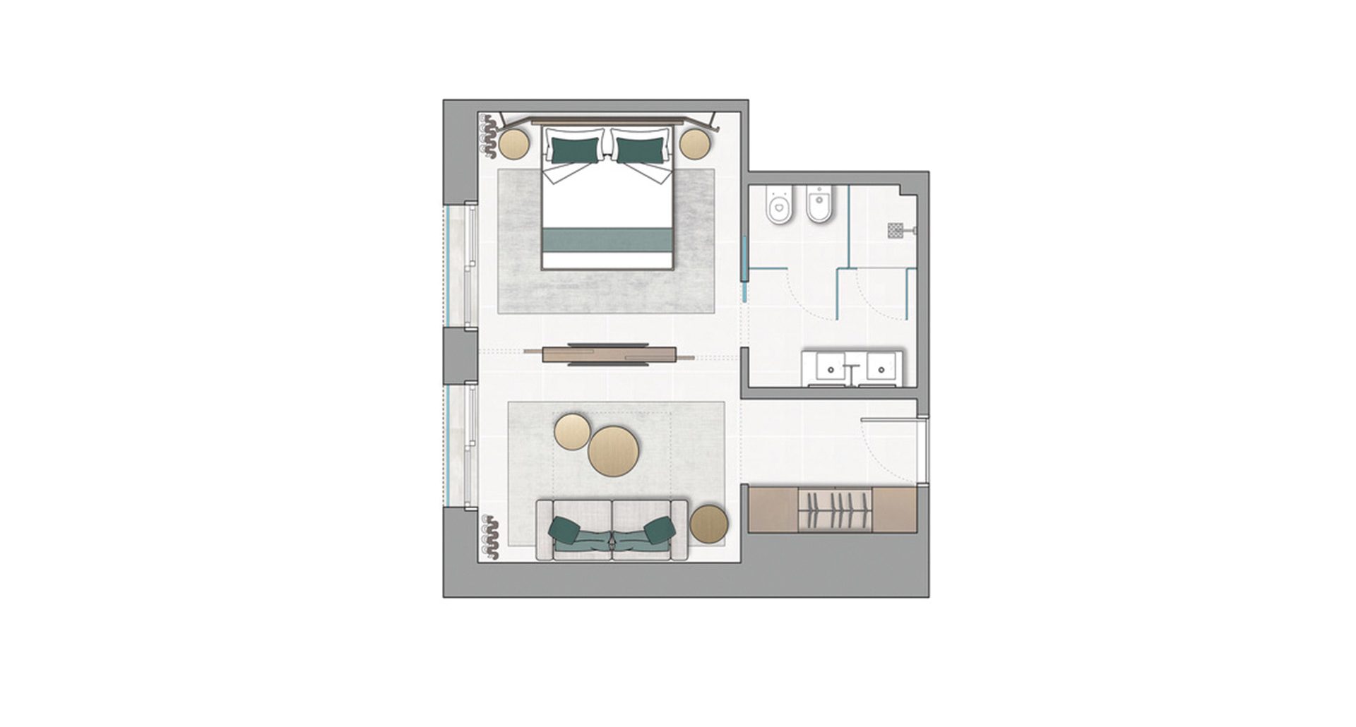 Un ambiente che combina funzionalità e stile, creando una cornice armoniosa per ogni soggiorno. Eleganza e luce morbida in una continuità tra camera e salotto che regala una sensazione di leggera fluidità.